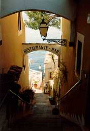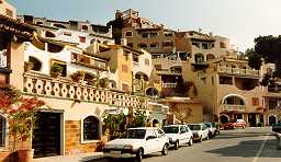 Dann meldet sich der Hunger und wir gönnen uns einen Heringstopf in einem kleinen Straßenrestaurant. Endlich ist es 12 Uhr, wir finden uns wieder im Hotel ein, beziehen unser Zimmer und kleiden uns erstmal witterungsgemäß ein. Eine kurze Verschnaufpause, dann sind wir schon wieder auf Tour. Am Hotel Mar y Pins steigen wir eine Treppe hinauf und geraten in ein eigenartiges Wohngebiet. Nach den vielen häßlichen Hotelbauten, die wir bisher schon zu Gesicht bekommen haben, herrscht hier eine erstaunliche Vielfalt, verwinkelte Hausstrukturen mit säulenverzierten Balkonen und Freiterrassen, alles am Steilufer gelegen mit herrlichem Blick auf das funkelnde Meer. Der Baustil ist wohl griechischen Elementen nachempfunden, die würfelförmig übereinandergeschachtelten Elemente erinnern an Bilder von der Insel Santorin.