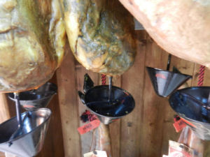 Serranoschinken-Ausschank. Der Schinken wir mit einem scharfen Messer