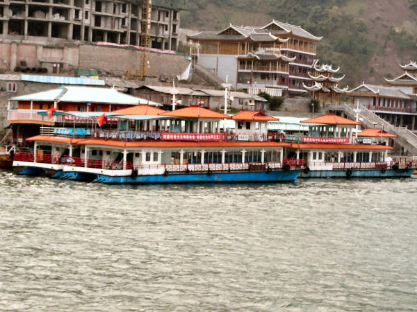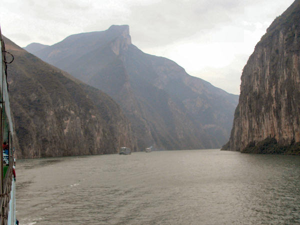 Zurück an Bord erwartet uns das Highlight der Yangtse-Reise: die Durchfahrt der Wu-Schlucht und der Qutang-Schlucht. Vor dem Aufstauen waren diese Routen durch Strömung, Strudel und Untiefen eine gefährliche Angelegenheit. Nun erinnert das Landschaftsbild eher einer Fjordfahrt, aber immer noch eindrucksvoll genug. Auf der rechten Seite taucht eine Felsformation auf, dort gibt es eine kleine Säule, und die wird als Chinesische Loreley bezeichnet. Wenig weiter hat man bereits eine Anlegestelle eingerichtet, von wo aus man auf einem Pfad dort hinauf wandern kann. Ein Verkaufskiosk ist auch schon da.