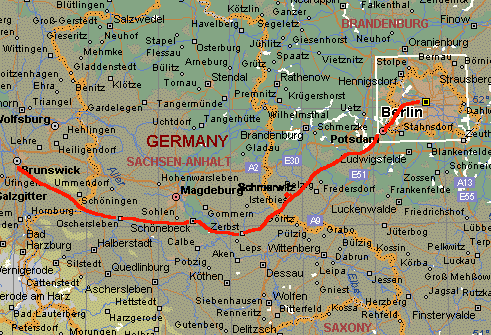 There is an official reason to go to Berlin this time: as if they were prophets the organizers have choosen Berlin one year before for a conference past the Pentecost (Pfingsten). So I start at the Tuesday, very early at 6 am in the morning. It was a desire over the years of the iron curtain to go east to unknown regions with a tailwind and without any obstruction. Now the iron curtain has become passable and the dream comes true. 20 minutes after breakup I reach the famous Salzdahlum, but because the castle has vanished there is no need to look in and take a message with me. I pass the bulky church and then spread my ears and turn my nose ahead.
