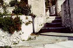 Unversehens erreiche ich ein Dorf, ich habe schon die Hoffnung aufgegeben, meinen Tagesplan zu erfüllen und weiß absolut nicht, wo ich mich befinde. Eine alte Frau guckt aus einem schwarzen Türloch, verschwindet wieder - man fühlt sich als Eindringling. Was hat man hier zu suchen? Andererseits sollen doch die Bergbewohner so gastfreundlich sein? Man muß ein wenig nachdenken, was sich geändert hat. Früher waren alle arm, konnten aber leben, und hatten immer etwas für einen Gast übrig. Heute ist man hier oben immer noch arm, da unten, an der Küste aber, da wird das große Geld verdient. Da sind die Menschen scheu geworden. So stelle ich es mir jedenfalls vor. Auch in diesem Dorf sind viele Häuser verlassen und verfallen. Ein Foto, dann finde ich über Treppenstufen, die für Esel gemacht sind, die Schotterstraße wieder.
