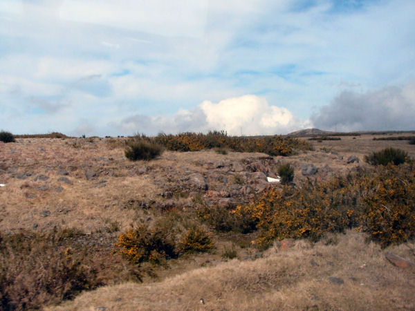 Die Weiterfahrt führt in das Landesinnere, durch ausgedehnte Eukalyptuswälder, die hier eigentlich nicht heimisch sind. Das Holz ist auch eher minderwertig und dient mehr dem Heizen und als Baumaterial. Die eigentlichen Urwälder der Insel werden wir später kennen lernen. Nach langer Anfahrt erreichen wir die Hochebene Paul da Serra auf ca. 1400 m Höhe. Hier gibt es eine Kolonie von Windrädern, aber auch mehr oder weniger unverfälschte Natur. Weite Flächen sind mit Ginster oder Stechginster bewachsen, wobei letzterer schon blüht. Noch vor nicht länger als einer Woche habe es einen Wintereinbruch mit viel Schnee gegeben, das waren die Straßen unpassierbar und die Leute eingesperrt - wie Liliana sich ausdrückt. Das schlimmste sei gewesen, dass es in den Läden keine elektrischen Heizgeräte mehr gab, die waren alle ausverkauft. Heute haben wir aber großes Glück mit dem Wetter und eine gute Aussicht. Unten in einem Tal liegt der Ort Rabacar, in dessen Umgebung sich die bekannten 25 Quellen inmitten einer grünen Hölle befinden. Dort haben viele Levadas, das sind in Stein gefasste Wasserrinnen zur Feldbewässerung, ihren Anfang, die gesäumt von schmalen Pfaden und mit geringer Neigung beliebte Wanderrouten darstellen. Auch hier oben befindet sich ein Wasserreservoir und ein Beobachtungsturm mit nebenstehender Antenne, womöglich falls Madeira einmal militärisch bedroht werden sollte.
