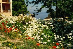 Caused by the surrounding cliffs here is much more natural life than at a sandy beach. You see small fishes who come into the flat zones and can be fed by bread. Small crabs sometimes come out of their shelters and crawl around. Beneath the sea surface there is much vegetation. Do you want some water-mushrooms?" two boys ask. "We just are not hungry" we say.