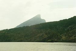 Bit we think the isle of Dragonera is much more interesting. This is a huge cliff, which is sloped from the south-east up to 300 m height and on the other side nearly vertically falls down to the sea. We slide under the jagged rocks and every climber would have his fun. But this is natural reservate and protected of all kinds of sportsmen. We then enter a narrow grotto and the motor is stopped. "Machin kaputt" they say. The cameras click and there is an echo too as you may imagine.