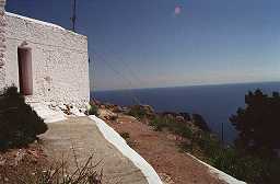 But first let us climb the final top. This is no problem, because they have build concrete (Beton) paved steps which could be passed by roller skates. And know on the top we find the rests of the monastery, some walls surround a small court yard with th small chapel as usual. Outside of the walls we have a phantastic view in all directions. Lindos to the south, the clouded Ataviros, Kolimbia under our feet and on the other side the best beach of Rhodes, Tsambika Beach. Everything only to be reached by car, that's it what they want. As i turn to go back a group of young Greek folks comes up, a Pries included. You must know, that this monastery is a pilgrims site to gain fertility.