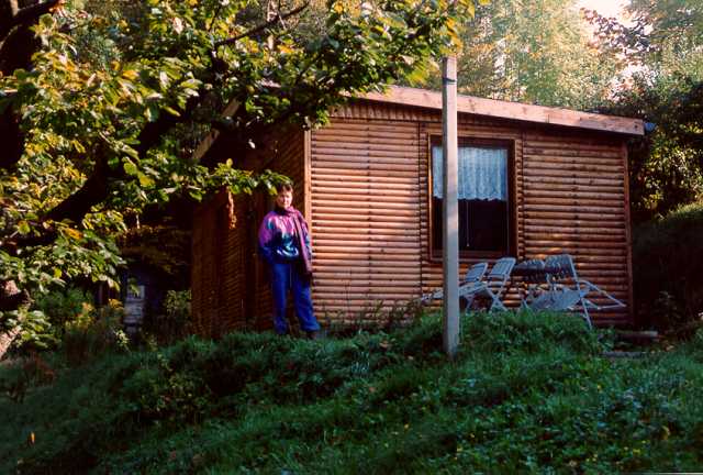 Endlich kommen wir auf den Bahnhof und schreiben uns zwei Züge von Zella-Mehlis nach Schmalkalden auf. Dann geht es zurück zum Auto. Auf der Straße liegt ein großer Haufen Briketts, einen Teil davon zerfahren die Autos zu Mus. Der zugehörige Schaufler trinkt gerade gemütlich einen Saft in der Sonne. Nun suchen wir unsere Bleibe, das gestaltet sich nicht ganz einfach. Wir irren auf steilen und unwegsamen Wegen zwischen Gartengrundstücken umher. Ein Mann, den wir um Hilfe fragen, kann sich nur mithilfe eines Mikrofons verständlich machen, das er sich an den Kehlkopf drückt. Nach einem abenteuerlichen Wendemanöver in einer steilen und engen Einfahrt erreichen wir endlich unser Ziel. 5 kleine Welpen, die dackelähnliche zugehörige Mutter und eine Katze bilden das Empfangskommite. Der Hausherr, der wohl in seiner Freizeit alte Autos wieder aufmöbelt, zeigt uns das hübsche Gartenhäuschen. Wir beschließen auch sogleich, bis Sonnabend bleiben zu wollen und richten uns ein.