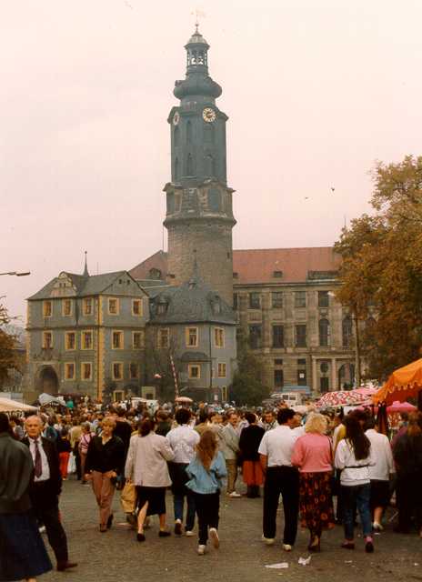 Von Ilmenau fahren wir auf der Bundesstraße direkt nach Weimar. Ich befürchte wegen des Zwiebelmarktes Verkehrsprobleme, auch ein Quartier ist womöglich schwer zu bekommen. Doch wir folgen den Hinweisen der Parkwächter (gebührenpflichtig). Auf einer Wiese bekommen wir einen Parkplatz neben einem Friedhof. Neugierig marschieren wir los. Es geht immer an der Friedhofsmauer lang. Man kommt auf dem Wielandsplatz raus, da steht auch ein Denkmal - von Wieland. Eine Ecke weiter der Frauenplan, hier befindet sich das Goethehaus. Nun beginnt auch der Trubel. Eine Popgruppe versorgt von einem Lastwagen herunter die Gegend mit Lärm. Viele Stände mit Zwiebelzöpfen, von denen der Zwiebelmarkt seinen Namen hat. Freß- und Imbißbuden, da geht einem das Herz auf. Wir eilen erstmal zur Information und fragen nach einem Quartier. Gestern sei gegen Abend alles ausgebucht gewesen, aber heute gibt es noch was. Ruck zuck ist die Sache erledigt, bei Familie Bartholomeß im Stadtteil Ehringsdorf, Am Anger. Da brauchen wir uns erst nach 18 Uhr zu melden. Prima, das hat geklappt.