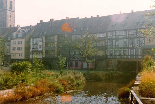 Heute ist nun der Wahlsonntag, da ist das Rathaus offen und wir können einen Blick hinein werfen. Um die Ecke liegt die berühmte "Krämerbrücke", eine durch eine Ladengasse überbaute Brücke über das Flüßchen namens Gera. Sowas findet man sonst nur in Florenz oder Paris.
